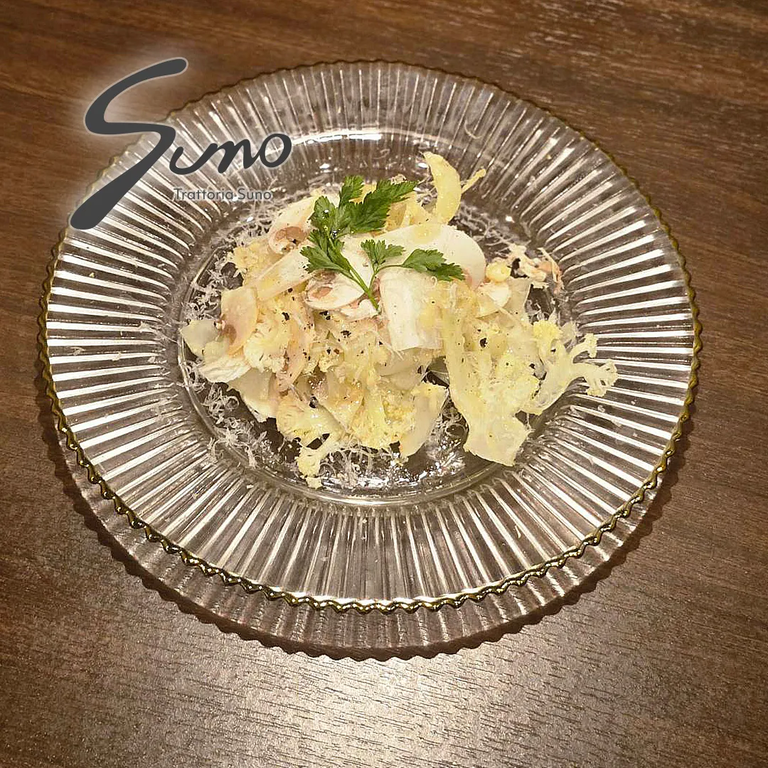 仕上げにチーズとブラックペッパーを添えた、素材の良さが引き立つシンプルな前菜です。