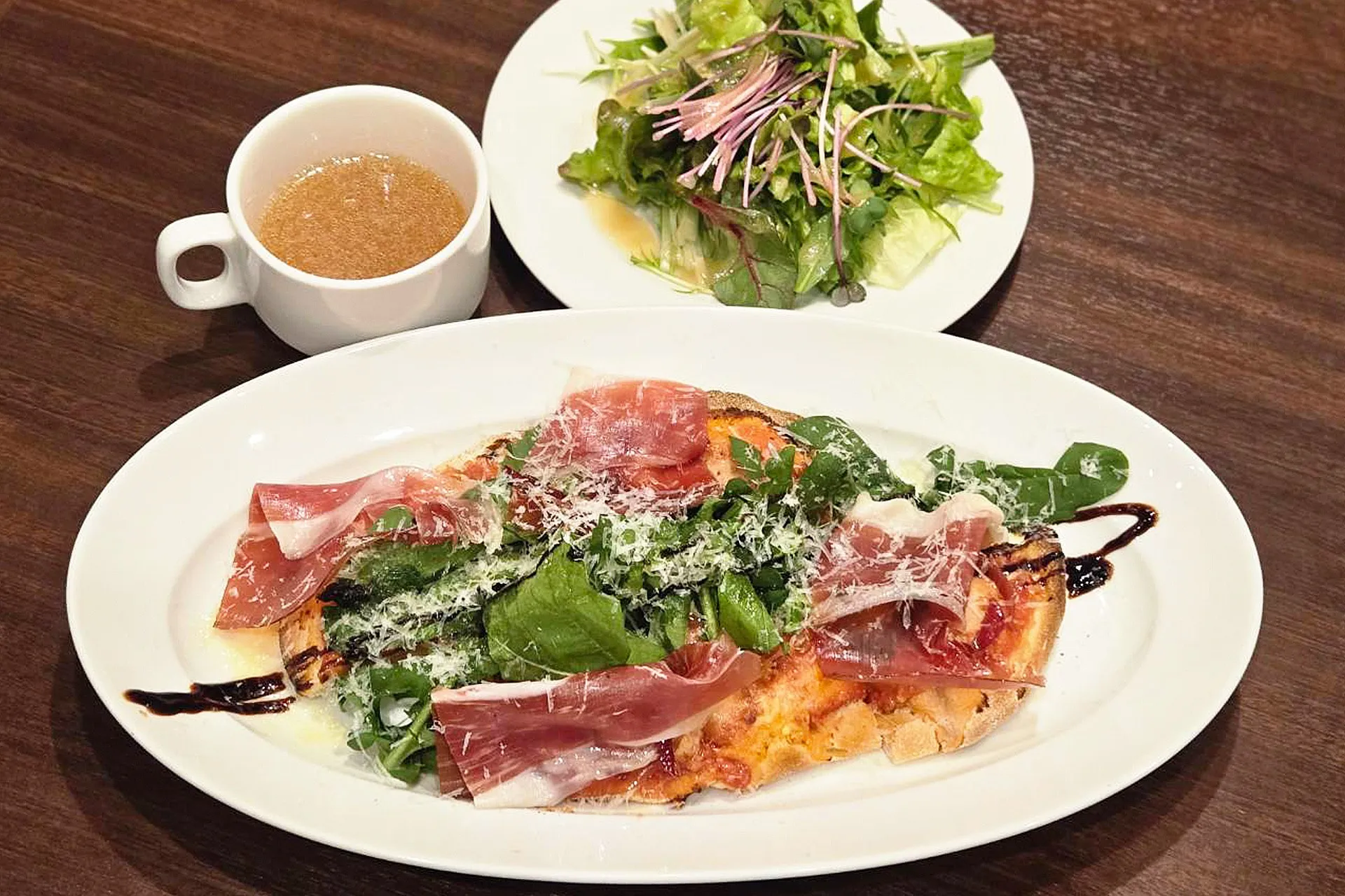 - 限定のご提供。ディナーでもご好評いただいている古代ローマのピザ、ピンサ・ロマーナ。生ハムとルッコラを乗せたトマトベースになります。スープ、サラダ付。